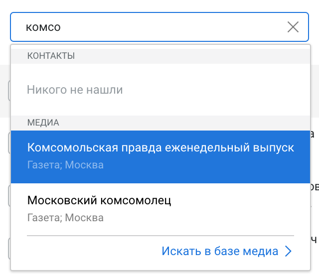 После введения хотя бы части ключевой информации в выпадающем меню вам будет предложено выбрать доступный контакт из вашей собственной базы или перейти к Базе медиа PREX для дальнейшего поиска информации там.