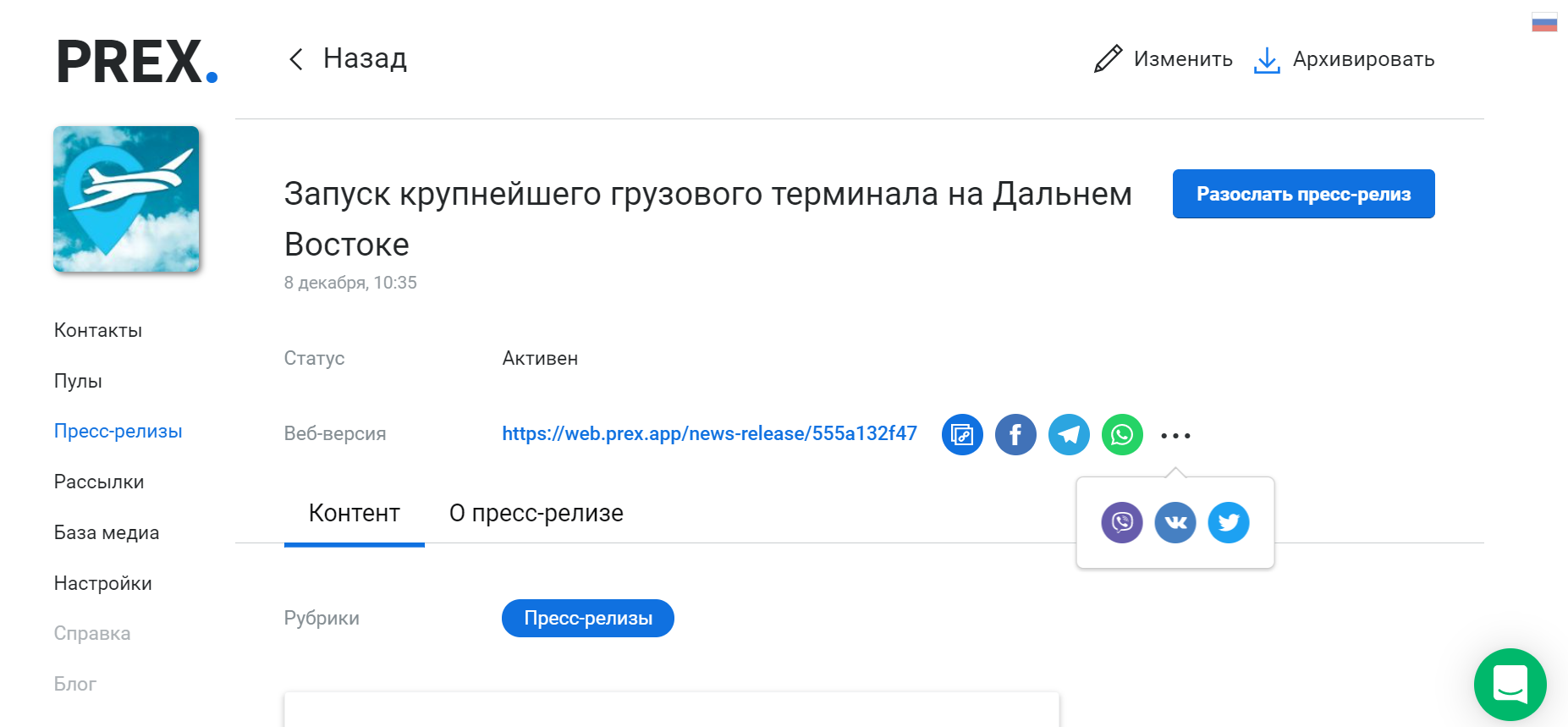 Каждый пресс-релиз в PREX имеет свою уникальную ссылку вида https://web.prex.app/news-release/555e142f4c. Используя эту ссылку, вы можете делиться пресс-релизом в чатах. Наиболее частый кейс использования онлайн пресс-релизов — добавлять их к сообщениям в мессенджерах при питчинге журналистов.