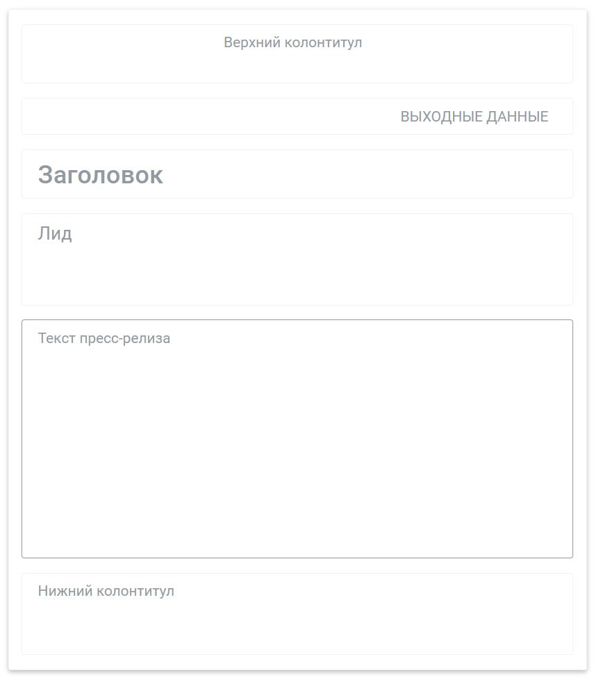 Редактор контента содержит уже готовый шаблон пресс-релиза. Вам остается лишь заполнить поля нужной информацией.